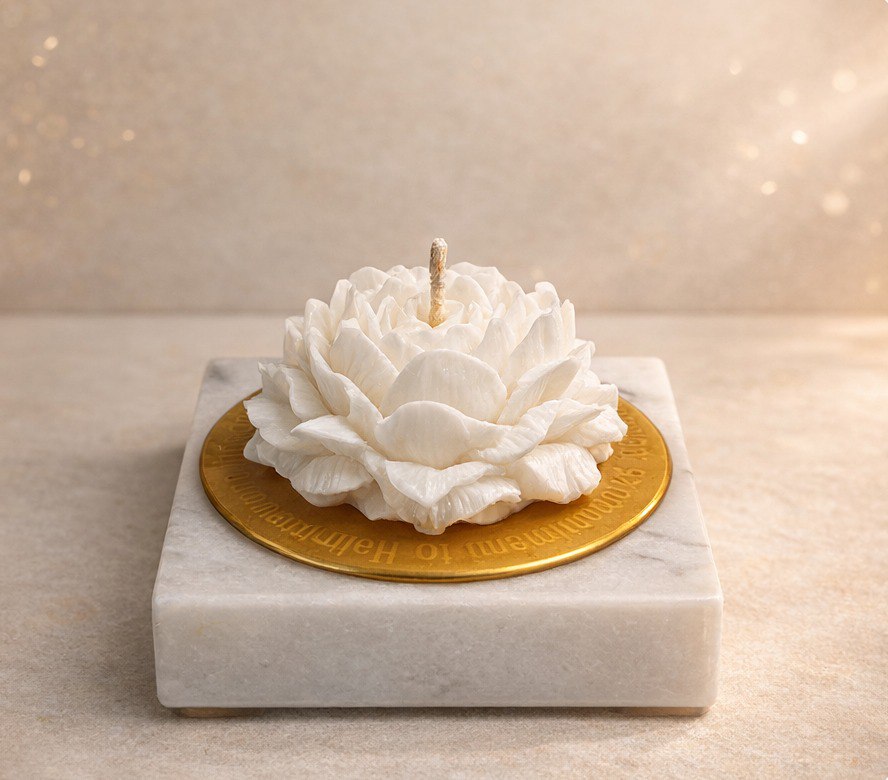 A handcrafted lotus-shaped candle paired with a sleek marble base and a gold accent plate. A clean, elegant piece that adds a soft, luxurious touch to any space—perfect for gifting or home décor.